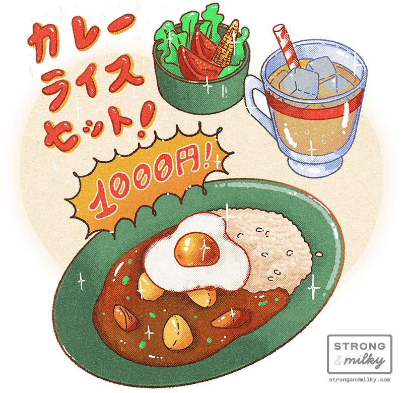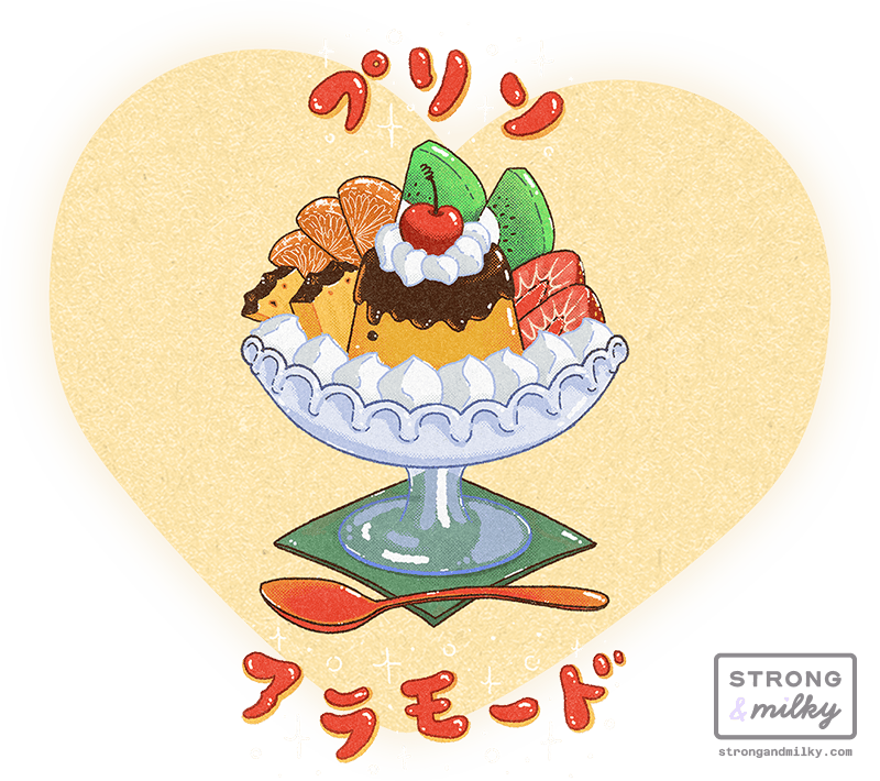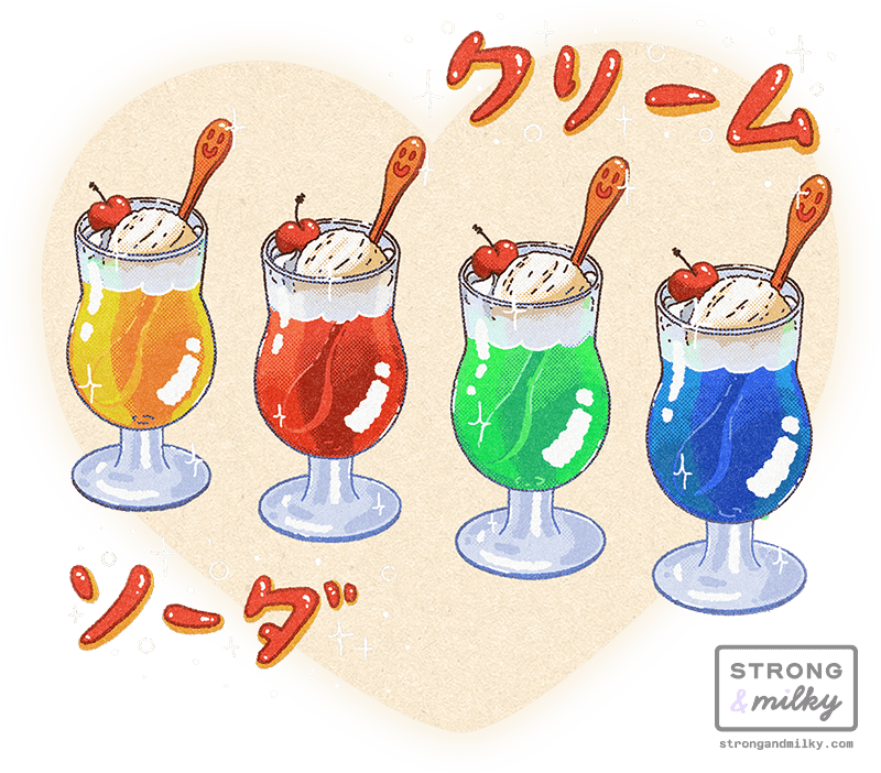 Kissaten Milky • 喫茶店ミルキー is a collection of food illustrations I started working on while travelling through Japan, depicting some of the most popular snacks and drinks served in this type of establishment, from colourful cream sodas to the iconic pudding à la mode.